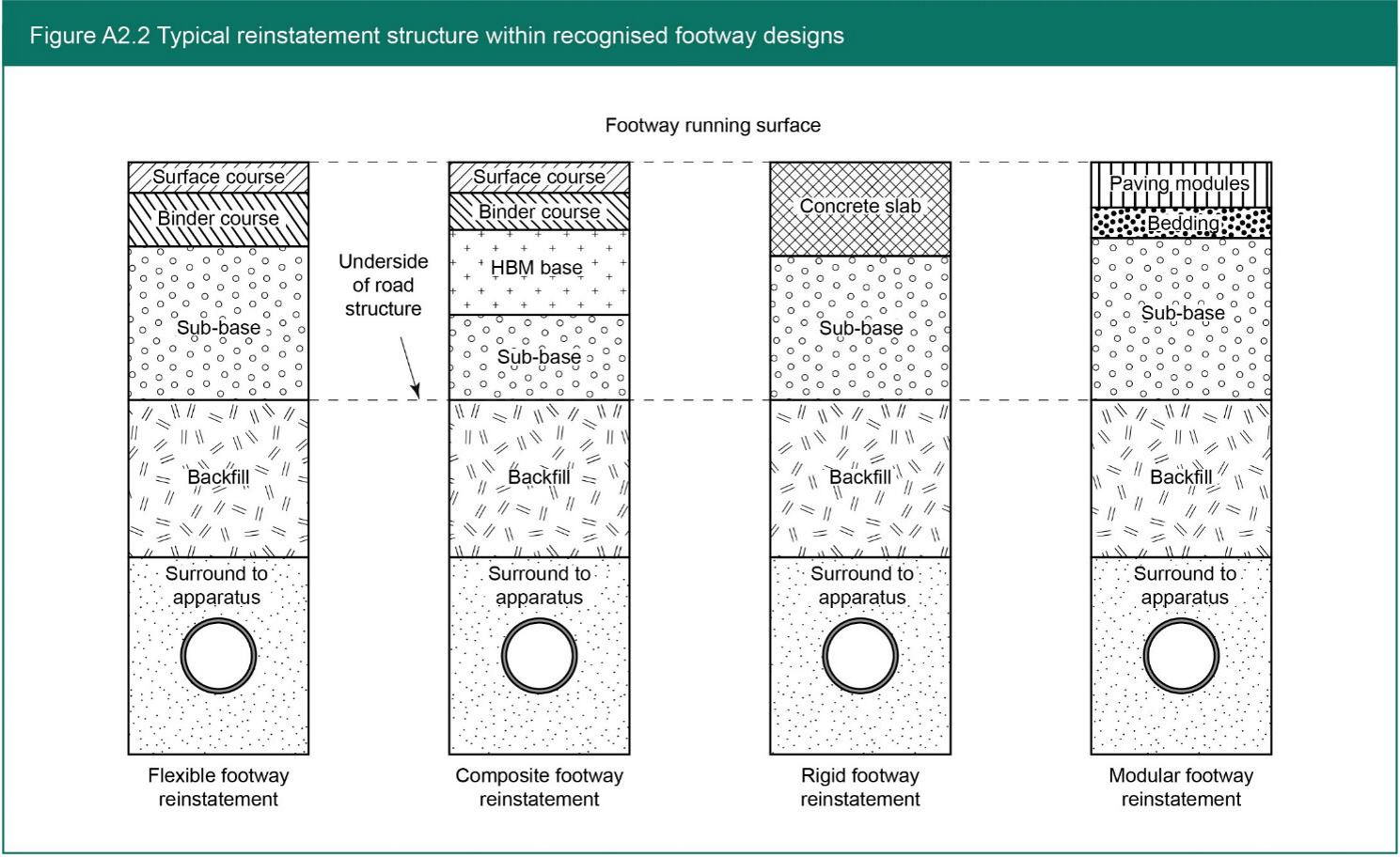 - Footway, footpath and cycle track structures are classified as flexible, composite, rigid or modular. Structures assumed to be representative of each are shown in Figure A2.2, including typical reinstatements, identifying the principal structural layers.