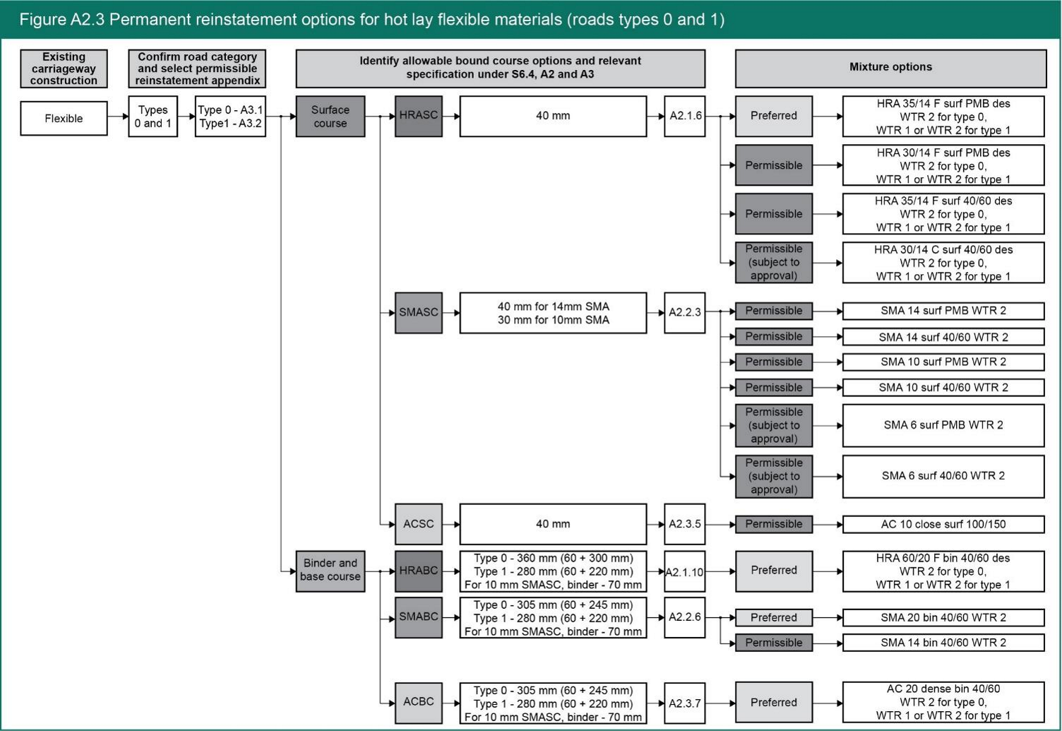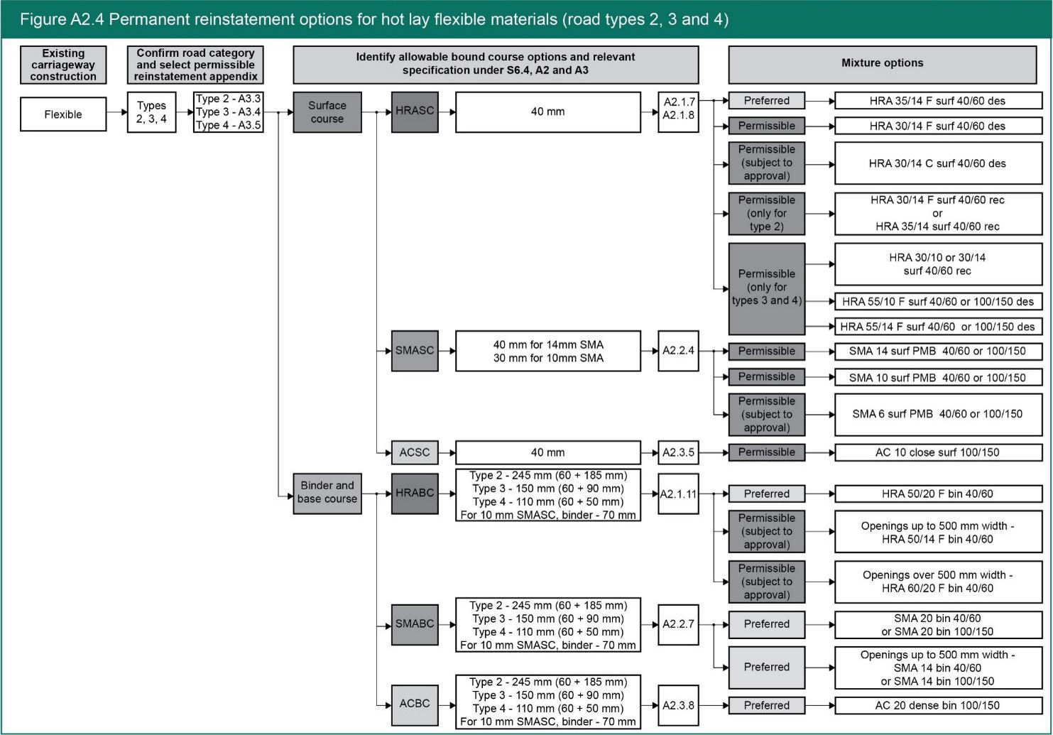 - The overall process for selecting the correct materials to reinstate flexible roads and footways is particularly complex at the reinstatement design selection stage. Figure S0.1 provides a generic overview of this process, but to assist practitioners, Figures A2.3, A2.4 and A2.5 respectively set out the summarised overall processes specific to: