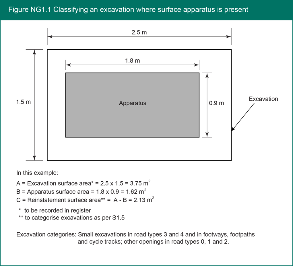 Excavation and trench categories (NG1.5) Previous Next Figure NG1.1 shows how to measure the reinstatement area to classify the excavation category when apparatus is present at the surface. Previous Next